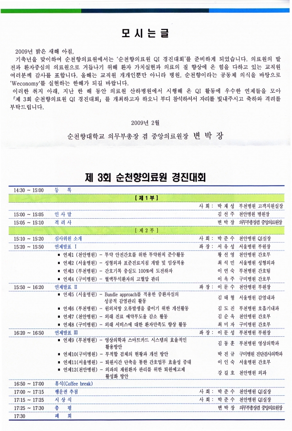학교법인 동은학원 순천향의료원 산하 순천향대학교 4개 병원(천안병원, 서울병원, 부천병원, 구미병원)이 함께하는「제3회 순천향의료원 QI 경진대회」가 다음과 같이 개최되오니 참석하시어 자리를 빛내주시기 바랍니다.